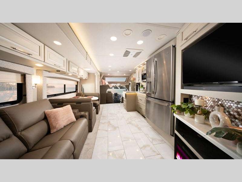 Sleeps 5 Slides 3 Length 39 ft 4 in Ext Width 8 ft 5 in Ext Height 13 ft 4 in Int Height 7 ft Interior Color Fieldstone, Saddle, Mountain Peak Exterior Color Bruin Blue, Cabernet Red, Black Beauty, Phantom Black, Super Blue Hitch Weight 12000 lbs GVWR 31000 lbs Fresh Water Capacity 72 gals Grey Water Capacity 80 gals Black Water Capacity 50 gals Tire Size 275/80R 22.5 Furnace BTU 40000 btu Generator Onan 8000 Watt Diesel w/ Auto-gen Start Fuel Type Diesel Engine Cummins ISB 6.7L Chassis Freightliner S2RV Horsepower 360 hp Fuel Capacity 100 gals Wheelbase 279 in Number Of Bunks 1 Available Beds King Torque 800 ft-lb Refrigerator Type Stainless Steel Residential Convection Cooking Yes Cooktop Burners 2 Shower Size 30" x 36" Number of Awnings 1 Axle Weight Front 10000 lbs Axle Weight Rear 21000 lbs Water Heater Capacity 10 gal Water Heater Type Aqua Hot 250 Hydronic AC BTU 30000 btu TV Info LR 50" LED TV, BR 32" Smart LED TV, Ext. LED TV Awning Info Girard Roof Mounted with LED Lights Washer/Dryer Available Yes Gross Combined Weight 43000 lbs Shower Type Standard Electrical Service 50 amp Solar Wattage 200 watts Similar Floorplans