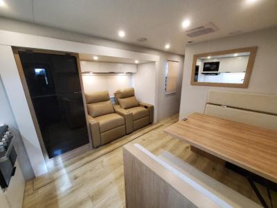 This travel trailer provides both comfort and convenience. At the front, you'll find a private bedroom with its own exterior entry for added privacy and ease of access. The middle bathroom ensures convenient access from all areas and includes a wardrobe with washer and dryer prep. In the main living space, a spacious 42" x 82" Mega Dinette provides a great spot for meals, games, or work, while theater seating across from the TV allows for relaxing evenings. At the rear, the fully equipped kitchen includes a cooktop with oven, a refrigerator, and a pantry with pull-out shelves for maximum storage and organization. A second exterior exit from the kitchen area adds extra convenience, providing both a comfortable and functional trailer.